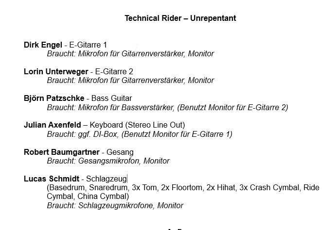 The music of Unrepentant combines the passion of melodic death metal with a powerful portion of metalcore. This is the idea that drove guitarist Dirk Engel and singer Robert Baumgartner to form in 2011. Drummer Lucas Schmidt, pianist Julian Axenfeld, rhythm guitarist Julian Müller and bassist Björn Patzschke complete the lineup that has been playing regional clubs and festival stages ever since.